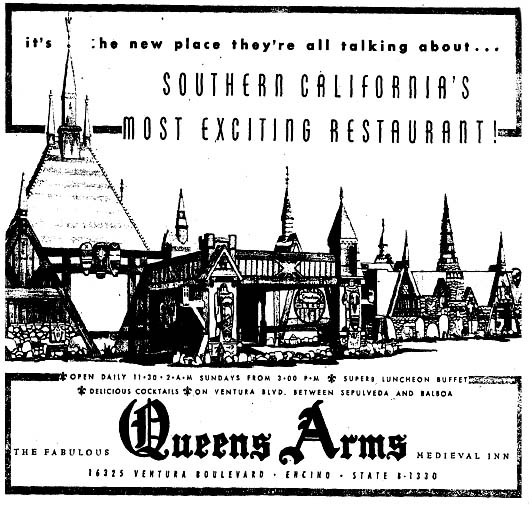 The Queens Arms was built by John and Chris Skoby, who also operated the Kings Arms in Toluca Lake. The restaurant was designed by Martin Obzina, the art director on “House of Dracula” and House of Frankenstein.” (OK, to be fair, he received Oscar nominations for “The Flame of New Orleans” and “First Love.”)
