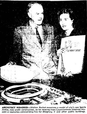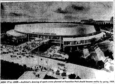 Here’s one plan that was actually built: The Los Angeles Memorial Sports Arena. Designed by the firm of Welton Becket, the arena was intended to be a 19,000-seat facility built for $5.7 million ($40,842,117.48 USD 2006).