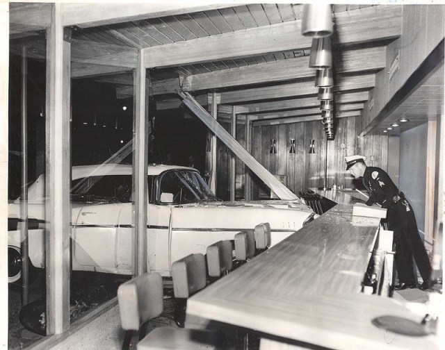 Sgt. C.H. Specht examines damage to Jan’s Restaurant, 8424 Beverly Blvd., caused by Gail Russell’s convertible. Below right, Russell fails a test for intoxication administered by Specht.