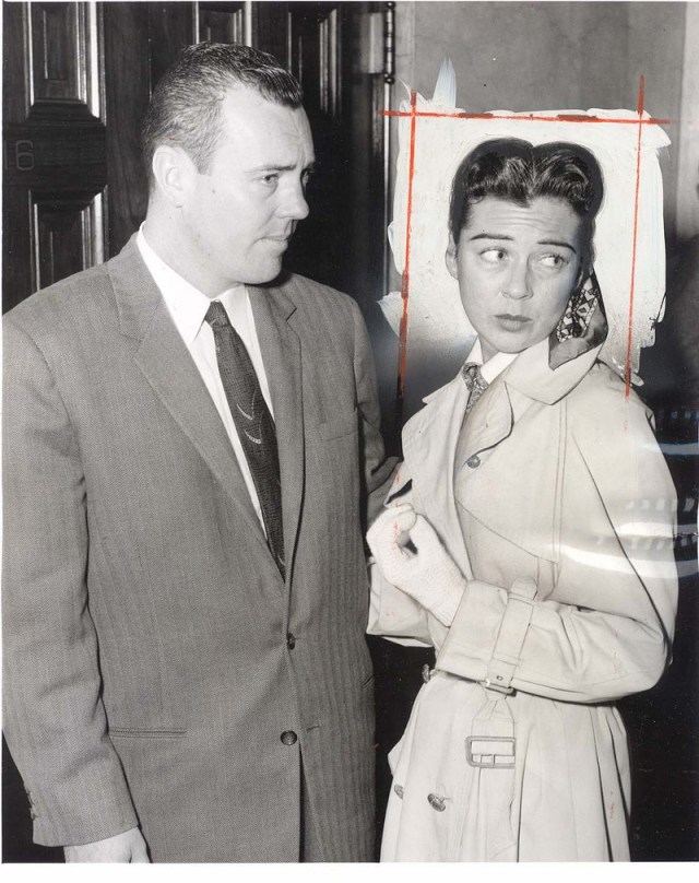 Russell and an unidentified man, presumably attorney Rexford Eagan, for another court hearing in 1958. She is 32 in this photograph. Note her dilated pupils.