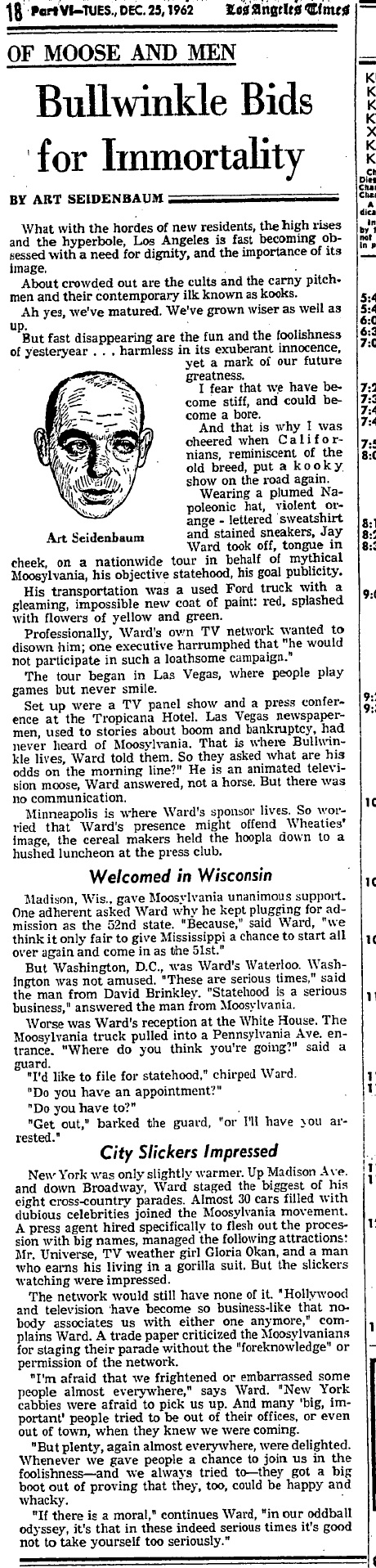 The late Art Seidenbaum on animation (and publicity) genius Jay Ward. Statehood for Moosylvania? As the 52nd state? As the story appeared, Dec. 25, 1962: