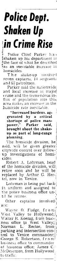 In the summer of 1957, Capt. Robert A. Lohrman, who had headed the Homicide Division since 1951, was transferred to the business office because he was planning to retire. The new head of Homicide was Capt. Arthur G. Hertel.