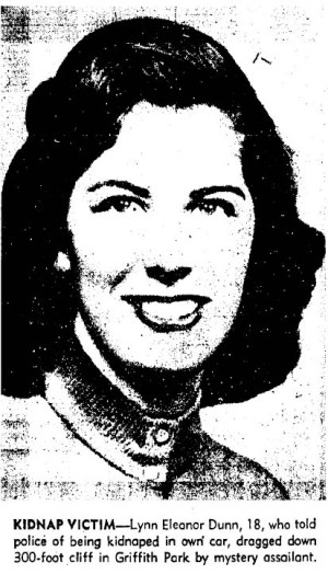 On July 26, 1957, she was returning home from her job as a telephone service representative when a gunman allegedly jumped into her car while she was stopped at New Hampshire and Finley avenues. Dunn said the man forced her to drive to Griffith Park, dragged her down a 300-foot embankment, beat her, kicked her, ripped her clothes, gave her some yellow pills and tried to attack her but apparently changed his mind.