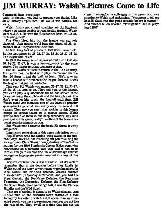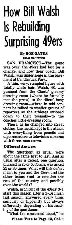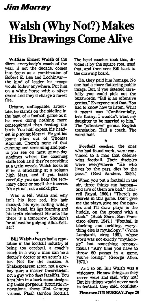 Bob Oates on Bill Walsh rebuilding the 49ers, Oct. 1, 1980; and Jim Murray on Bill Walsh, Jan. 10, 1982: