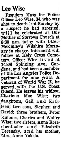 Leo Wise, 34, left a widow, two sons and two daughters, ages 2 to 9. He joined the police force Jan. 5, 1948.