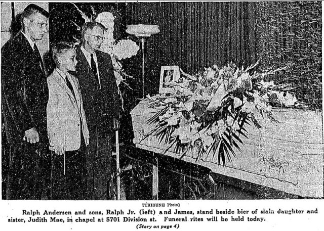 The Tribune described Judith as 5 feet, 8 inches tall, weighing 150 pounds, with blond hair and blue eyes. She was active in athletics at Austin High School, according to her father. “She was helpful around the house, she was obedient and she was strong, much stronger than the average girl,” Ralph C. Andersen said. She was “a swell gal,” Robert Andersen said. She was confirmed on Palm Sunday 1954 at St. Peter Evangelical and Reformed Church, 5448 Diversey Ave.