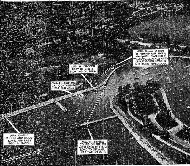 About 11:45 p.m. on Saturday, Aug. 17, 1957, Edwin Thomas, 53, and his wife were fishing on the east pier of the harbor. “A car drove down the gravel road from Montrose Avenue alongside the harbor,” Thomas said. “It stopped about a block from us, across the harbor, made a U-turn and then stopped a few feet from the harbor edge, on the grass which borders the drive.