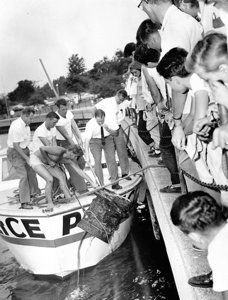 About 11:45 p.m. on Saturday, Aug. 17, 1957, Edwin Thomas, 53, and his wife were fishing on the east pier of the harbor. “A car drove down the gravel road from Montrose Avenue alongside the harbor,” Thomas said. “It stopped about a block from us, across the harbor, made a U-turn and then stopped a few feet from the harbor edge, on the grass which borders the drive.