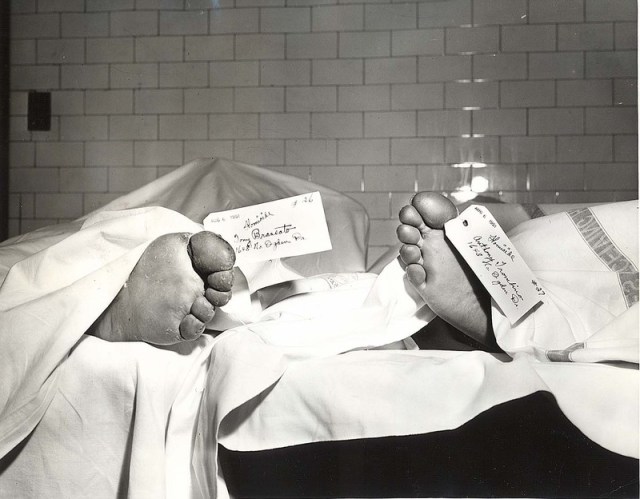 When Willcockson went to take the “crime doesn’t pay” toe tag shot in the Los Angeles County morgue, the medical examiners were busy performing the autopsies on Brancato and Trombino. So the enterprising photographer borrowed the toe tags, put them on two other bodies and took his morgue shot. How do I know? It says so on the back of the photo.