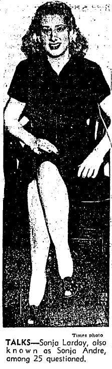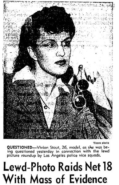 George Washington Richter died in Los Angeles County in 1958 at the age of 62, but it’s unclear if this is the man in the pornography ring. Times clips show that In 1945, George W. Richter provided film processing for yet another pornography operation and was linked to one of the more significant people of the adult film industry in the first half of the 20th century: Frank Ries. (Photos of Vivian Stout, above, and Sonja Larday, at right, are from the 1945 raid).