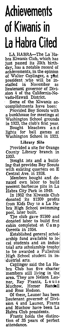 Time for some good news! A salute to the La Habra Kiwanis Club! And special congratulations to former club President Ray Frantz for 35 years of perfect attendance! Frantz was also a member of the Orange County Farm Bureau. The clips show he was a prominent avocado grower and served as a judge at the 1936 California Avocado Show.