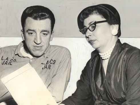 Caryl Chessman and attorney Rosalie Asher. Note the heavy retouching in which the entire background was painted over.