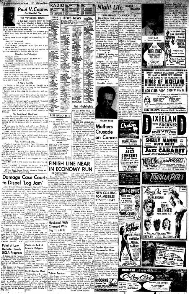 Below, we have Paul Coates and his old pal from Palo Alto, Parkey Sharkey … But what’s this hidden in the ads for the burlesque houses? The Colony Club, Western and 149th Street, has the L.A. Dodgerettes! … Then again, there’s “Johni Dillinger” a.k.a. “Public Anatomy No. 1,” at the Tiffany Club, 3260 W. 8th … And note the comic at the Lake Club: Bert Henry. Henry did a bunch of “party records” for Fax Records (“Bert Henry in the Raw,” “Bert Henry at the Hungry Thigh”) before the head of the company, William H. Door, and his girlfriend were killed in a very nasty way in November 1963. Fax also released a disc titled “Sex Is My Business,” which purported to be interviews with prostitutes. Most of the Fax discs turn up on EBay if you’re patient. If anyone knows whatever became of Bert Henry, drop me a note.
