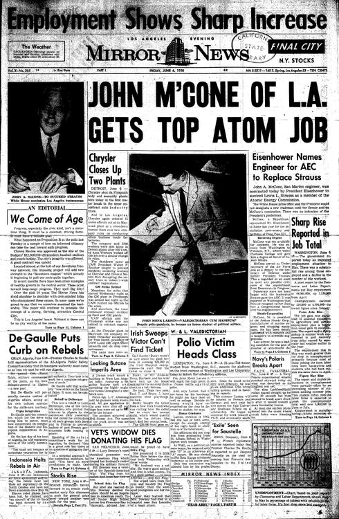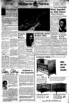 A couple of odd, sad stories… A Spanish American War veteran’s widow dies while donating the flag from his casket to a junior high … A student with polio graduates as valedictorian from Washington and Lee University … And the Mirror praises passage of Proposition B as a sign that Los Angeles has come of age. Placing Dodger Stadium downtown, the heart of the metropolis, spells “Big City,” the Mirror says …