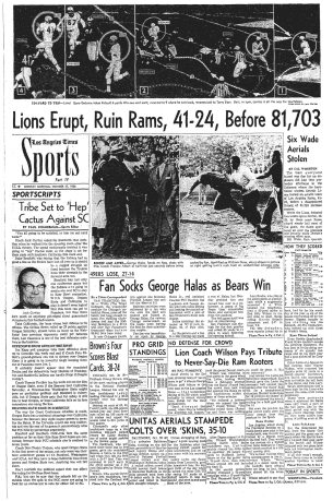 Players of the game: The Lions’ defenders, or as The Times’ Paragraph of the game: “The crowd did an unusual thing when the Rams were unable to work up a head of offensive steam. They started booing.” Really, booing the home team was unusual in 1958 Los Angeles? –Keith Thursby |