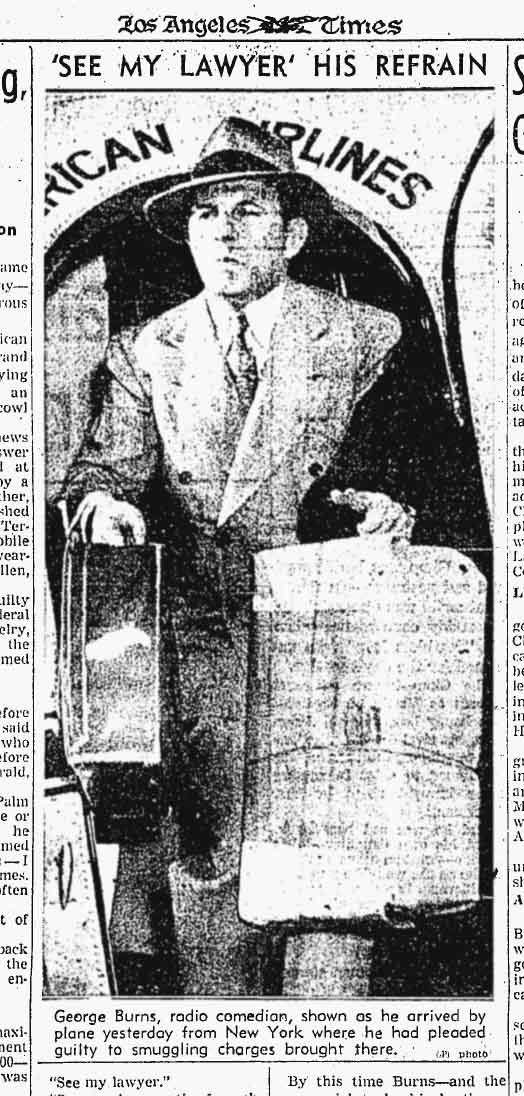 Supreme Court Justice Edgar Lauer fired Rosa Weber on the spot, and the Nazi maid promised to get revenge. Within days, federal customs agents were searching the Lauers’ apartment for expensive clothes and jewelry that had been smuggled into the country by a charming, debonair con man named Albert N. Chaperau. At least that was his name at the moment. Investigation revealed that his claims of being a Nicaraguan diplomat, his ploy for getting baggage through customs without inspection, were utterly false. In fact, Chaperau was born Nathan Schapiro and under that name had served 18 months in Leavenworth Federal Penitentiary after being convicted of mail fraud in 1919. Box Office magazine lists him as an associate producer of “Mayerling,” and imdb gives him credit on “L’Affaire du courrier de Lyon,” but one might wonder whether any of that is true. Quite a few stars of the 1930s were questioned in the investigation, including Sophie Tucker, Katharine Hepburn and Kenny Baker (he’s the love interest in the Marx Bros. “At the Circus”). But the main figures were radio comedians George Burns and Jack Benny. Burns was indicted on charges of smuggling two bracelets and a ring valued at $4,885 ($71,206.15 USD 2007). Faced with 18 years in prison and a fine of $45,000, Burns pleaded guilty, saying that he didn’t know the items were smuggled.