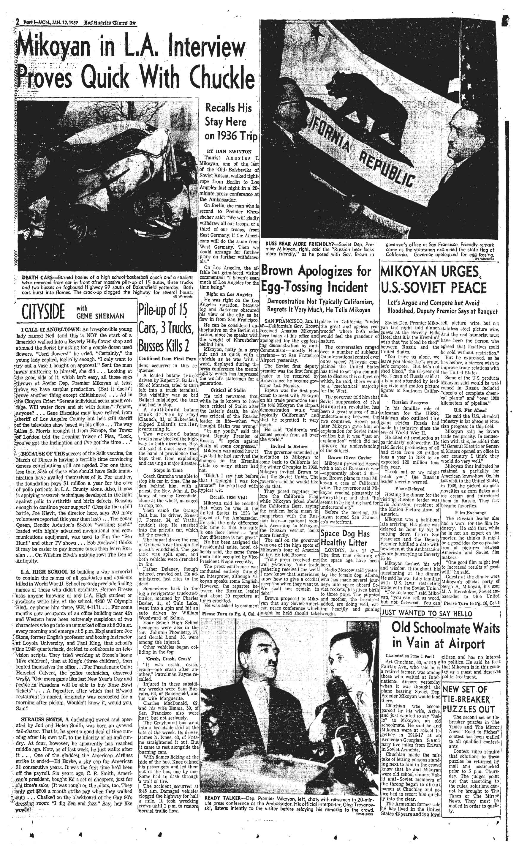 Today, Anastas Mikoyan (1895-1978) is hardly a household name and his trip to Los Angeles is mostly a footnote to history. His AP obituary didn’t even mention that he had visited the city. With the nation’s fears about communism and the Soviet Union, public sentiment was far different and his brief stay received wide publicity.