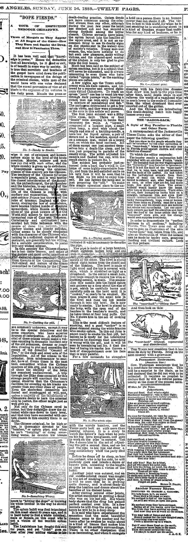 June 16, 1889: After quite a long rant on the degenerate nature of the Chinese — the maids and cooks are corrupting the good white homes of Los Angeles by providing narcotics to young, idle society men and women — the reporter gives detailed steps on how to cook and smoke opium.