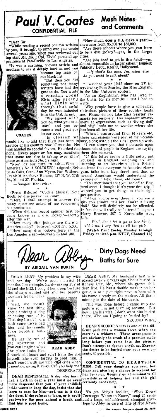 August 29, 1959: Paul Coates hears from Elvis fans who want to forgive him for the scathing review Coates wrote of Elvis’ notorious performance at the Pan-Pacific Auditorium. Dear Abby has advice for a man whose wife doesn’t care for her dog.