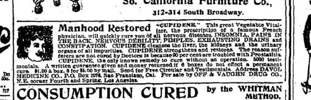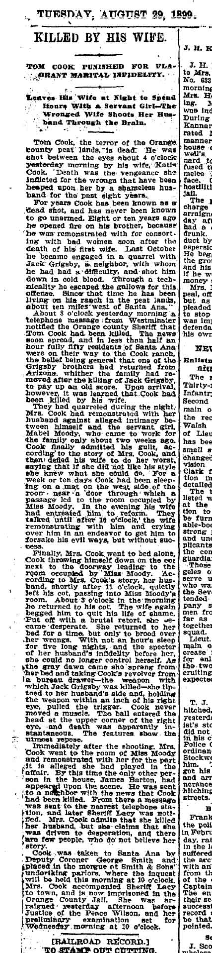 Aug. 29, 1899: Cupidene restores lost manhood.Katie Cook kills her husband, Tom, the terror of Orange County’s peat country, as he sleeps because he refused to stop his affair with their new servant girl. The jury acquitted Cook in less than 15 minutes.