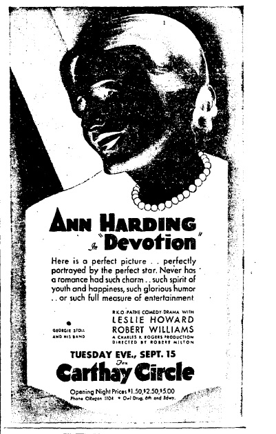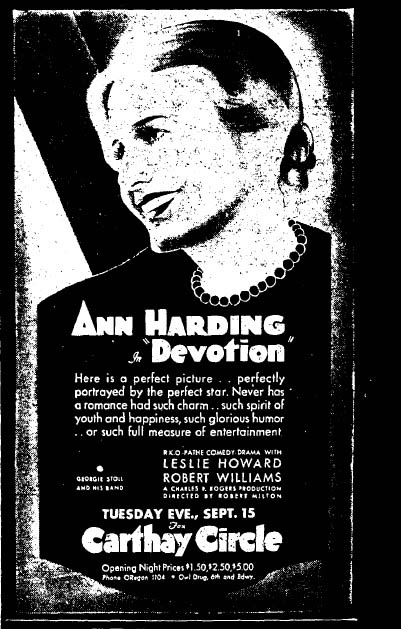 Sept. 13, 1931: Ann Harding in “Devotion” at Carthay Circle. I wonder what they were thinking by reversing the image.