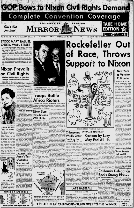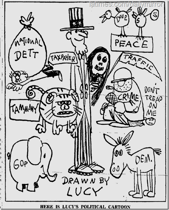 | July 26, 1960: The “Peanuts” story line involved Lucy drawing a political cartoon and submitting it to a newspaper. Because readers never saw the cartoon, the Mirror asked artist Charles Schulz what it looked like. Here’s his answer.