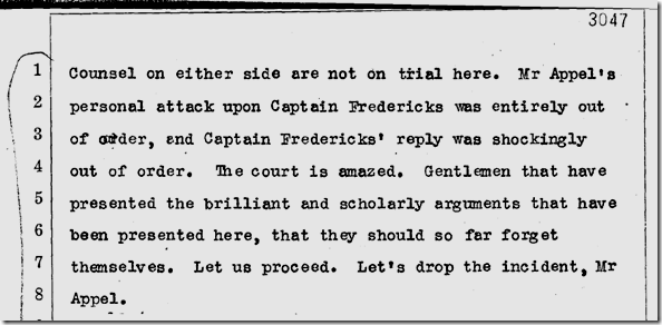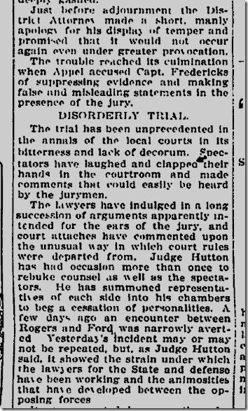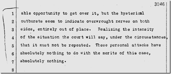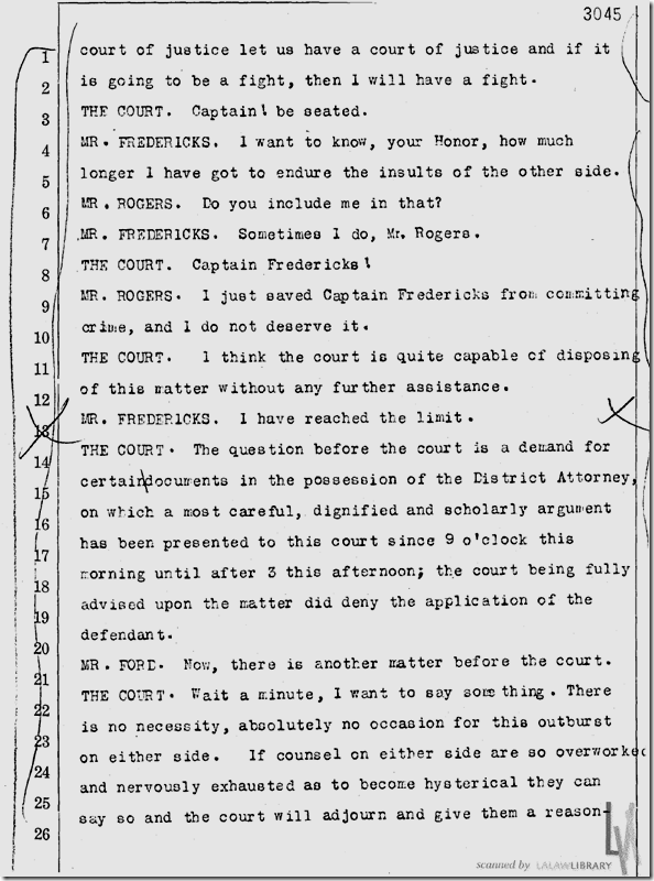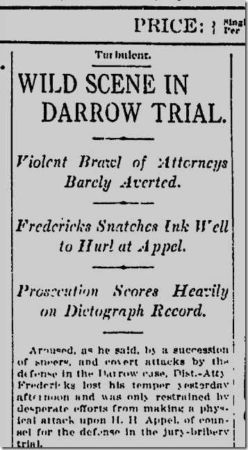 | June 25, 1912: And here we have the battle of the inkwell in the trial of Clarence Darrow. Dist. Atty. John D. Fredericks loses his temper and tries to throw a four- or five-pound inkwell at defense attorney Horace Appel over “a succession of sneers and covert attacks.” Defense attorney Earl Rogers and bailiff Martin Aguirre prevent Fredericks from throwing the inkwell, with Rogers suffering a deep gash to the wrist.