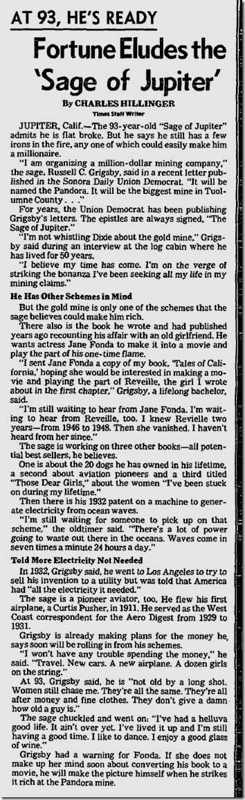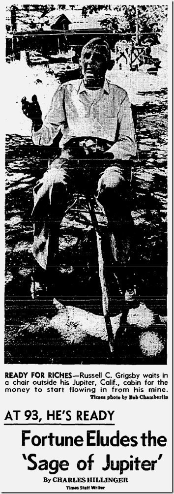 | Oct. 11, 1980: Charles Hillinger interviews Russell C. Grigsby, the 93-year-old “Sage of Jupiter, Calif.” He’s about to strike it rich with a gold mine … and a couple of bestselling books … and a way to generate electricity from ocean waves. |