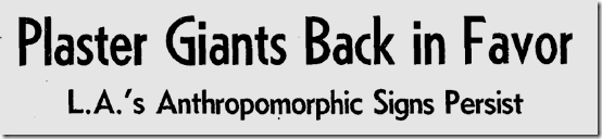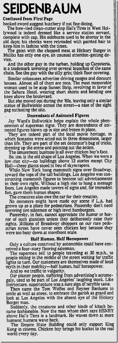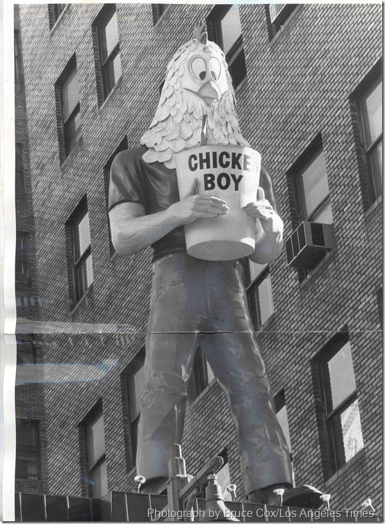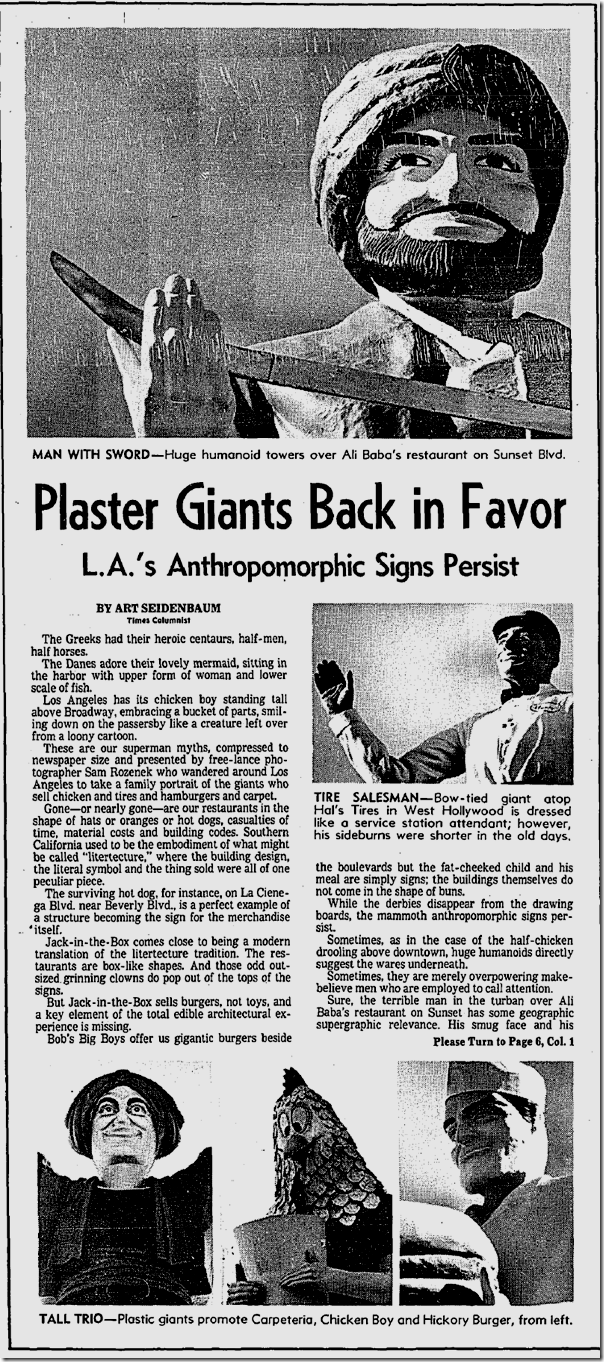 In 1977, Art Seidenbaum looked at oversized signs as part of Los Angeles’ vernacular architecture, which he called “litertecture” as in “literal architecture.” Chicken Boy’s oversized playmates included a turbaned swordsman over Ali Baba’s Restaurant on Sunset Boulevard, the Carpeteria Giant, the supersized mechanic for Hal’s Tires in West Hollywood and the Colossus of Hickory Burger.