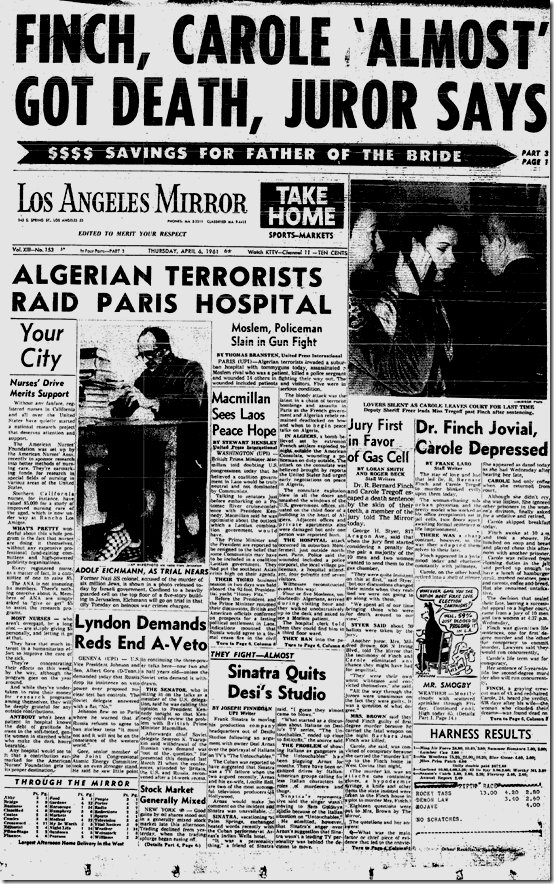 I have not had much exposure to the Cooley case, which occurred in Kern County, except that James Ellroy used to talk about it all the time and it is certainly one of the notorious killings of the early 1960s. The details of the killing are particularly gruesome and part of it was witnessed by the Cooley’s teenage daughter, Melody, so I’m a little reluctant to dredge up all the gory details. A purported affair with Roy Rogers (yes, that Roy Rogers) — which he and others denied — was also dragged into the courtroom. It is a nasty, lurid case. |