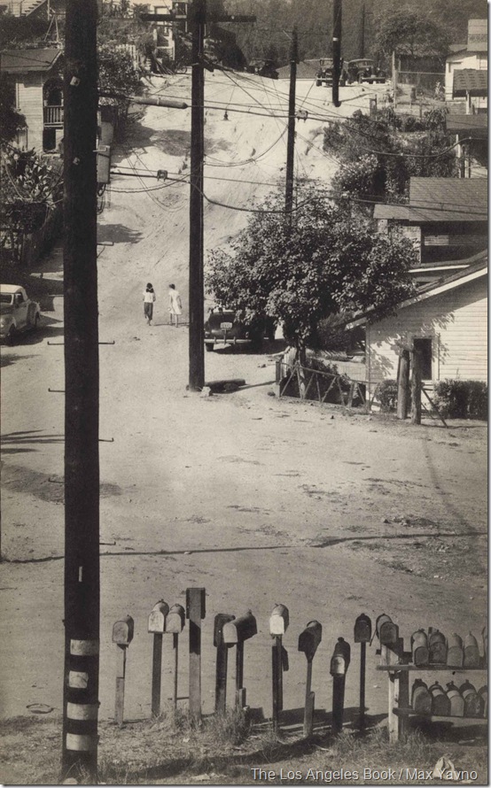Yavno’s photograph of Chavez Ravine is the reason I bought the book. The Times file photos I have found of the area were taken after most of the houses were cleared away. This is the only image I know that shows what it was like before the bulldozers rolled. Notice the dirt road and ramshackle mailboxes, the antithesis of the post-World War II mania for modernization.