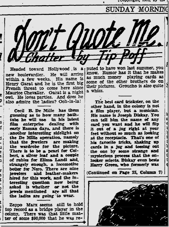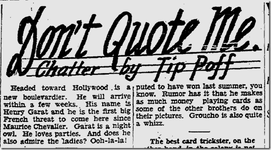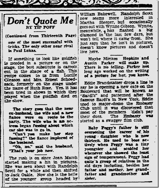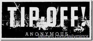 July 17, 1932: I’ve been meaning to post some of the Tip Poff gossip columns that The Times used to run in the movie/drama pages of the 1930s. The Times experimented with the column and by 1939 was calling it Tip-Off! Isn’t this March 19, 1939, logo great? Of course it was too bold for The Times, which dumped it immediately.I’ll try putting Tip Poff in the afternoon slot as a substitute for Paul Coates and Matt Weinstock. They will return for January 1962, when The Times absorbed their columns after Otis Chandler killed the Mirror-News.