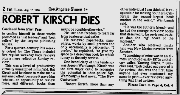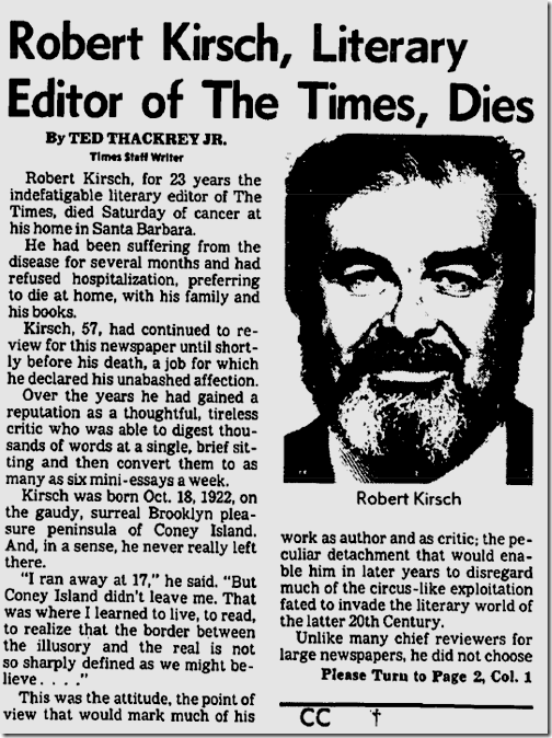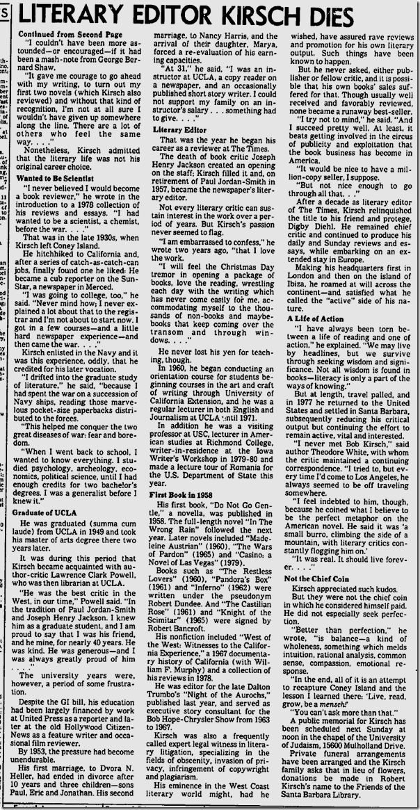 After I lost hope and optimism, duty kept me going. Kirsch (d. 1980) was The Times book editor for 23 years, and the paper gives an annual Robert R. Kirsch Award that “honors a living author with a substantial connection to the American West whose contribution to American letters deserves special recognition.” I felt an obligation to do more than take the book back to the library and forget I ever cracked the cover. Finally, there was nothing but curiosity. Maybe if I randomly flipped through pages I would find something worthwhile. Instead, all I encountered was tedious emotional thrashing. I will leave it for someone else to seek a lesson in the tale of a distinguished book critic who goes off the rails trying to write a novel. Fortunately, Kirsch is remembered today for raising the caliber of literary criticism at The Times from the shabby work that was routinely published in the 1930s and ’40s. Here are some selections, courtesy of the optical character recognition software on my scanner. The sand was blown into clean dunes by the winds of the night and a slight crust had formed on the surface. The surf was a slate-gray mass bubbling into white, almost a solidification of the colors of the day. . . . He called out her name, but the call seemed weak against the sound of the waves and the enormous vault of the sky. She did not answer, nor could he see her anywhere. . . . Footprints led nowhere and his eyes ranged the shore and water. He saw only the timid birds and the gatherings of kelp floating. He tried to reason but his reason brought in its wake pale, frightening visions. She was dead. Suddenly the sea appeared both weapon and fate, mocking him with its mindless motion and its sounds. Christ, was she dead? He had wondered so many times before whether she was capable of that final act, that act to punish at last the entire world by assessing the final punishment on herself. Once you invade or are invaded, he realized, there is no turning back. The aggression committed, it is only left to wander in the breached fortress and the bombed streets of the soul… . THE letter looked like something out of the past: a brittle blue envelope of good quality, quite thick enough to be interesting. And the name on the return address was not familiar: Mrs. Ernest Putnam, Scarsdale, New York. It was addressed to Sue in the hand of a woman who affected a thick nub pen and the blackest of ink. Frank Chesney carried it in with the usual assortment of bills and circulars and the smooth bulk of Life magazine. Had it been his letter, he would have opened it immediately, but he knew that Sue would be able to wait. That was Sue, and he supposed that was one of the reasons he loved her. Lunch was set on the kitchen table with the best silver and linen napkins. Three camellias floated in a shallow ceramic dish in the center of the table. At his place was the morning paper and a glass of tomato juice. That is, it looked like tomato juice. He knew, in fact, it was a Bloody Mary and a good stiff one at that. When he lunched with clients he avoided liquor, but when he lunched at home, which was two or three times a week, he relished this drink. It warmed him as the ceremony of lunch with Sue did. He heard her upstairs with the slight tinkle of a tray. Marv, their middle son, their ten year-old, was home with German measles and Sue fixed his…. :: By 9:30, the children were all in bed, Marv and Sid asleep, Tom reading. Sue was in the kitchen making potato salad for the birthday party and baking the cake. Frank read fitfully for a while but the house seemed to imprison him. He called in to Sue to ask for a cup of coffee. “It’s your third,” she said. “You won’t be able to sleep tonight.” “I know,” he said impatiently. “But I need something. I feel shaky.” Sue brought the coffee. He tasted it, the dregs of the dinner pot. “You’ve been pacing like a tiger,” Sue said. “Is there anything the matter?” “Not a thing,” he lied. “I guess things went too well tonight. Dinner quiet, bedtime perfect.” He forced a laugh. “I’m not used to it.” “Why don’t you go to a movie?” Sue asked. He knew that he wanted to see Pat. He had been thinking constantly of her since the afternoon. No calls came although he had waited late at the office. He had even walked back home on Santa Monica hoping that he might see her coming out of the lab, had considered for a moment going in there. But he hadn’t. He resisted the impulse for some deeper reason. “No. No movies,” he told Sue, regretting that he had thrown away a chance to go out. But something had forced him to say it. Sue said, “Well, I’m no help, I know, but I’ve got to get the cake done.” She went back to the kitchen. In twenty minutes, he knew he had lost the fight. He had to get out. Frank called into the kitchen, “Sue. I need some fresh air. I think I’ll drive out to the beach.” He said it quickly before he could change his mind. “I think you should,” she said. “What do you mean?” he asked, a challenge he had not intended in his tone. “I mean it’ll do you good to get away,” she replied. “I just want some fresh air, some time to think,” he said. “I know,” she said. “I’m not objecting. Go ahead.” He put on his jacket and left hurriedly. Frank felt as though his actions were directed toward some predetermined path. It was a strange sensation, as though he were an iron filing dancing into the pattern of lines of force. He remembered seeing such an experiment in a college physics course. The instructor had placed a paper over a magnet, poured some filings on it and then tapped the paper once or twice with his finger. An inevitability, he had thought as he sat there. Physics had not interested him at all. He had had to take two science electives in his undergraduate work and physics was one of them. The immutability of physical laws had somehow offended him. Did they apply to man? Could 