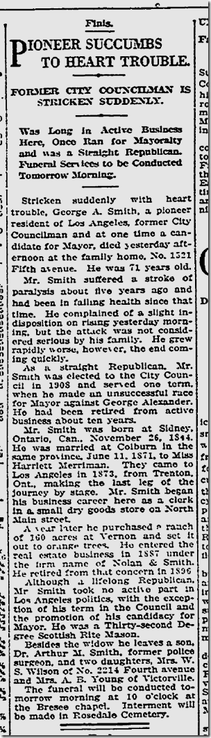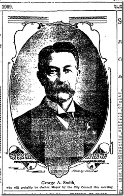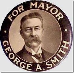 A campaign button for George A. Smith has been listed on EBay. The vendor mistakenly identifies the individual as Mayor George Alexander. Actually, this is onetime Councilman George A. Smith, who ran unsuccessfully for mayor in 1909 against Alexander. |