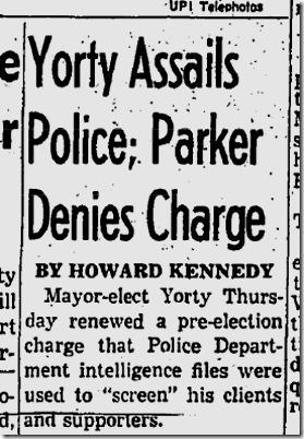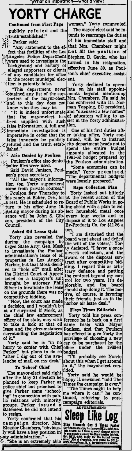 | June 9, 1961: Mayor-elect Sam Yorty comes out swinging, with charges that the LAPD was spying on his supporters, and he takes a little shot against The Times. Police Chief William H. Parker quickly disputed Yorty’s allegations, saying they were “patently false.”The relationship between the mayor of Los Angeles and the police chief is one of the most essential – and conflicted – in local government (think of Chief Daryl F. Gates and Mayor Tom Bradley, who didn’t even speak to each other). And I cannot recall a honeymoon that was shorter than the one between Yorty and Parker.