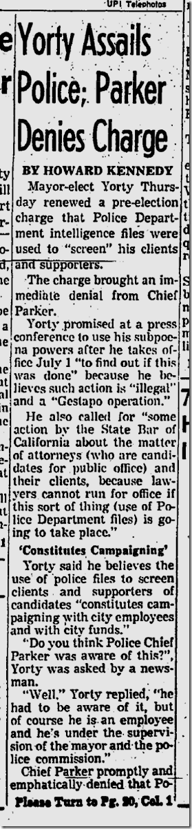 | June 9, 1961: Mayor-elect Sam Yorty comes out swinging, with charges that the LAPD was spying on his supporters, and he takes a little shot against The Times. Police Chief William H. Parker quickly disputed Yorty’s allegations, saying they were “patently false.”The relationship between the mayor of Los Angeles and the police chief is one of the most essential – and conflicted – in local government (think of Chief Daryl F. Gates and Mayor Tom Bradley, who didn’t even speak to each other). And I cannot recall a honeymoon that was shorter than the one between Yorty and Parker.
