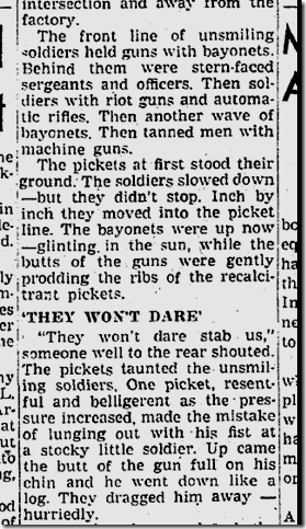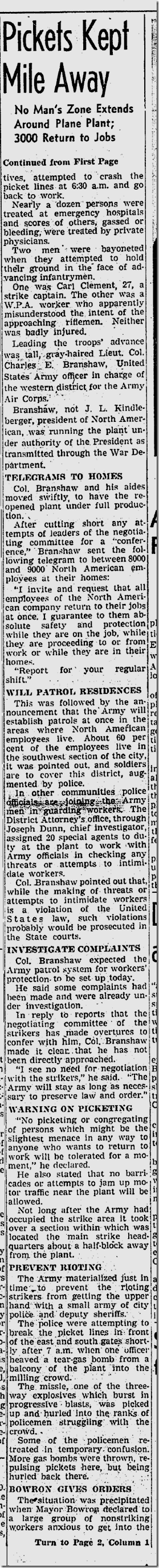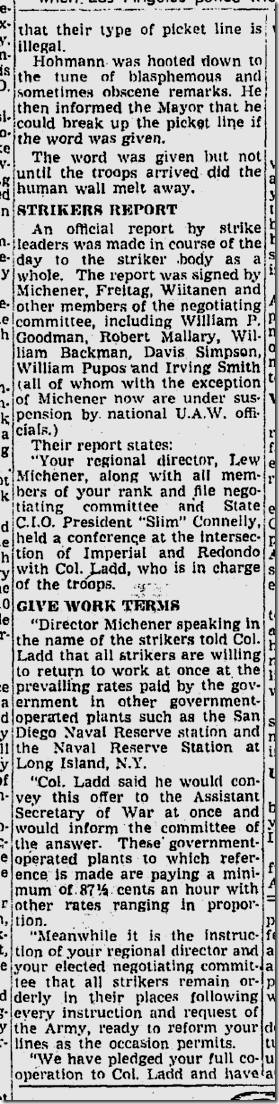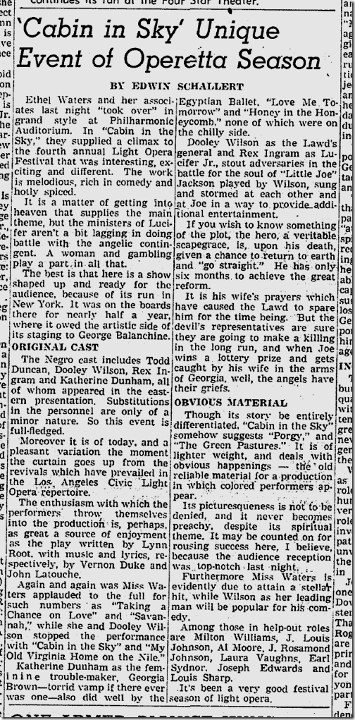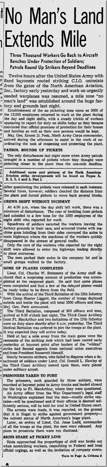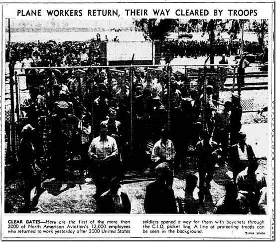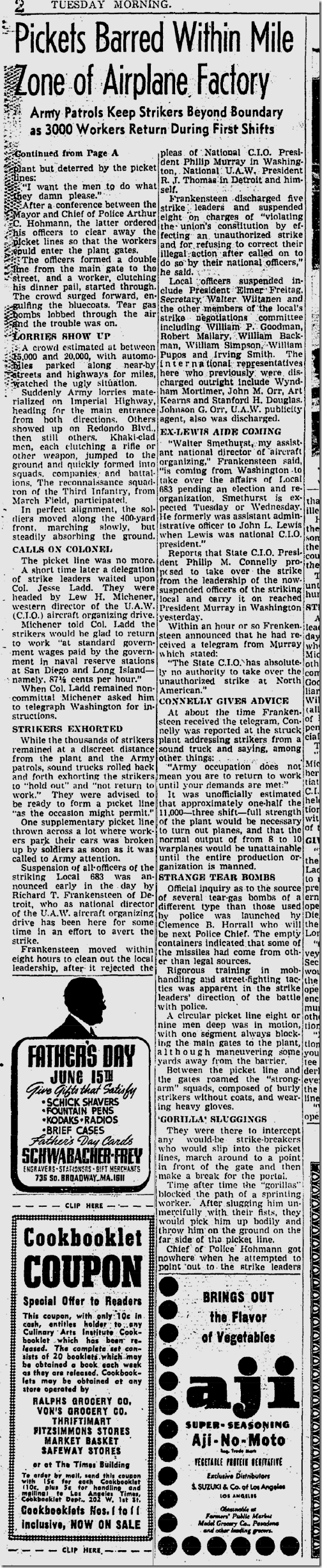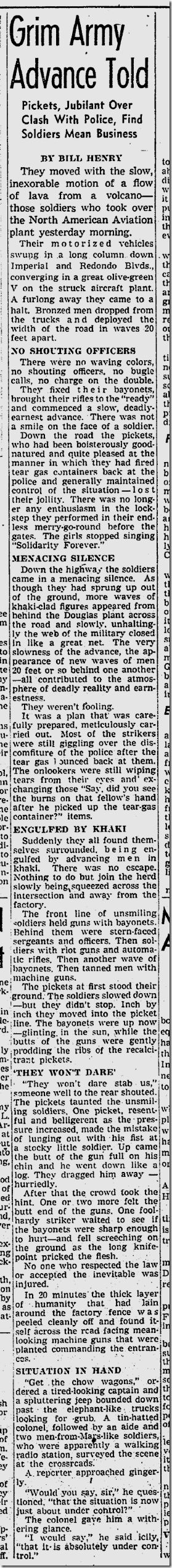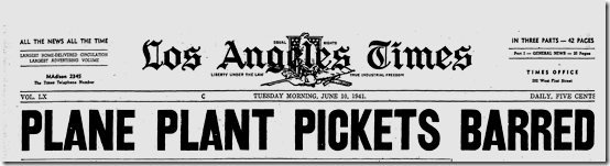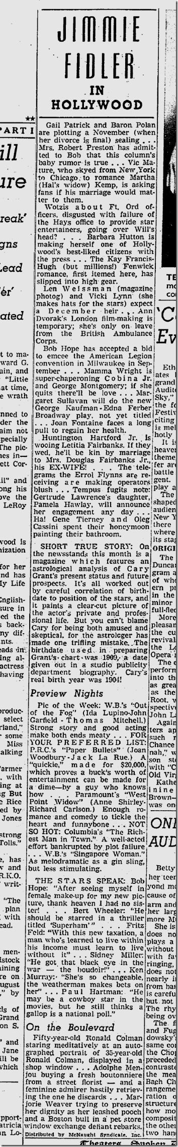 June 10, 1941: Bill Henry files a color story on soldiers using rifles with bayonets to herd strikers away from the North American Aviation plant. Unfortunately, my new optical character recognition software can’t handle these old clips, so I have to post the images of the stories. Henry’s story is worth reading. Also on the jump, Ethel Waters stars in “Cabin in the Sky.” Jimmie Fidler says: On the newsstands this month is a magazine which features an astrological analysis of Cary Grant’s present status and future prospects… The birthday used in preparing Grant’s chart was 1909, a date given out in a studio publicity department biography. Cary’s real birth year was 1904! |