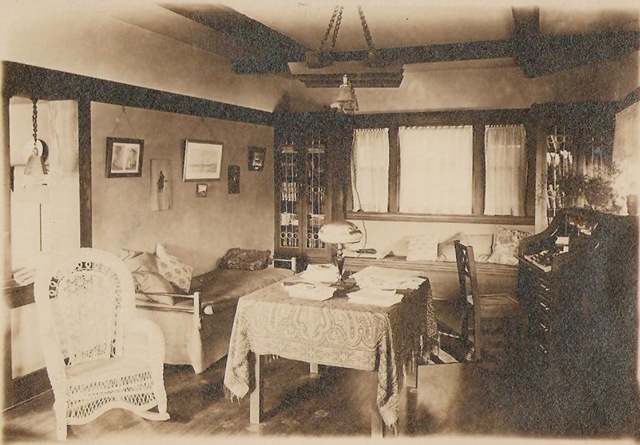I suppose it seems as though I spend lots of time on EBay – the answer is yes and no. This postcard, showing the interior of 118 W. Avenue 44, Los Angeles, (dated 1910) has been listed on EBay. It appears that the house is gone. Property Shark keeps taking me to 118 EAST Avenue 44, which is another Craftsman house. Notice the light fixtures, the roll-top desk and the wicker rocking chair.