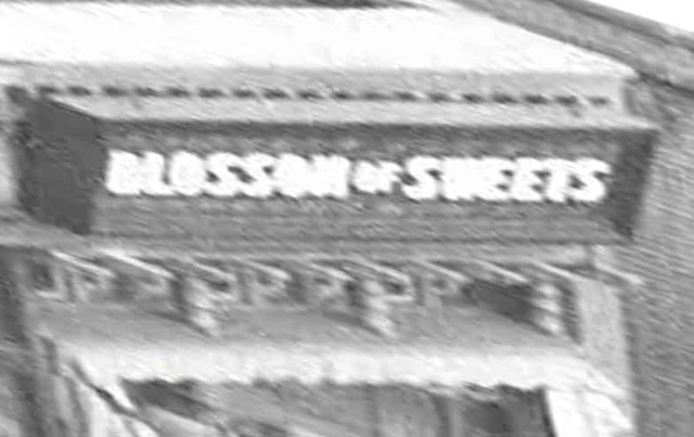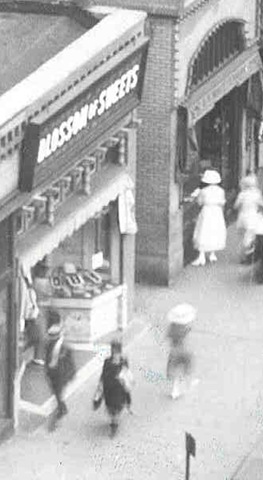 I’m always amazed by the amount of detail in the large-format photos used before the advent of the 35-millimeter camera. Enlarging the top photo from “Safety Last” reveals shoppers passing the Blossom of Sweets shop, 849 S. Broadway.
