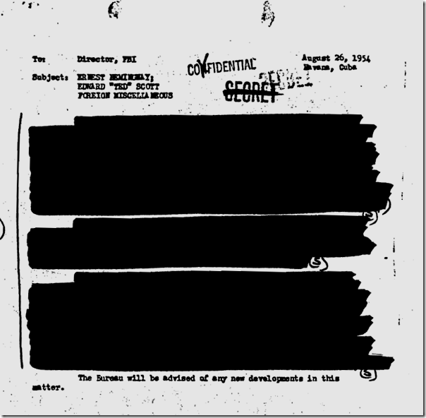 I had the strangest experience Saturday when I was going through Ernest Hemingway’s FBI file. I was sure the buro had posted Louis Armstrong’s dossier — it’s brief and not terribly interesting except for the fact that it exists. Or did it? I went to the online reading room but there was no Louis Armstrong. And then I noticed the file on Arthur Ashe was gone… And … Gracie Allen? I knew Armstrong’s file was posted because I used it when I talked to a class about public records. What gives?