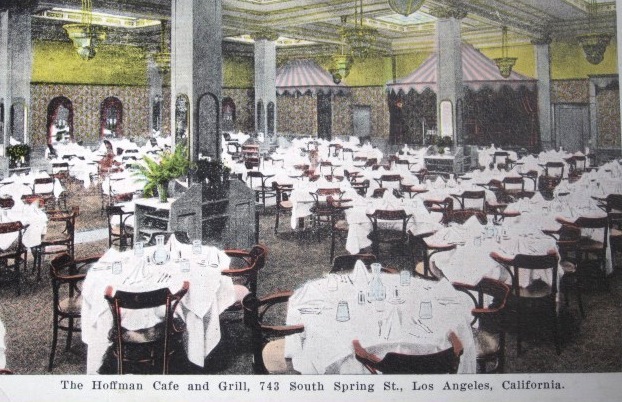 For years, 743 S. Spring was the home of Levy’s Cafe, but sometime in the early 1920s the address became Hoffman’s. It’s not clear from The Times’ clips as to what occurred. This is what fine dining looked like in downtown Los Angeles c. 1921. This postcard has been listed on EBay. Bidding starts at $9.99.