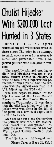 Nov. 26, 1971: D.B. Cooper bails out with $200,000. Credit: Los Angeles Times