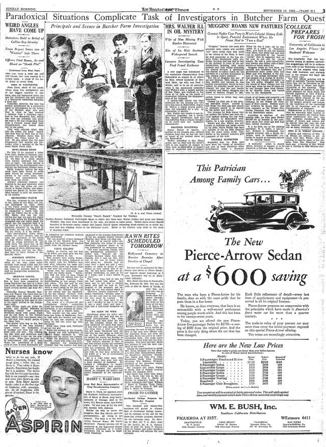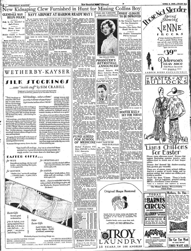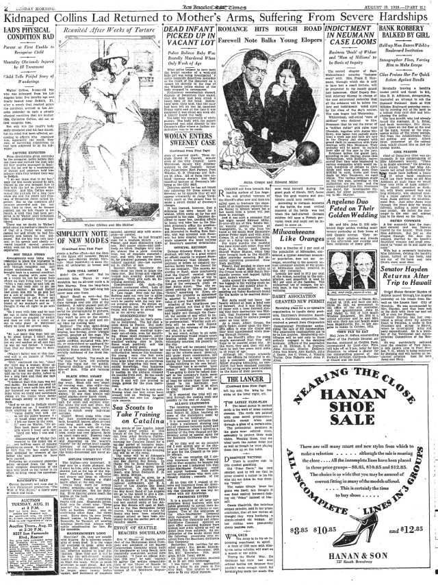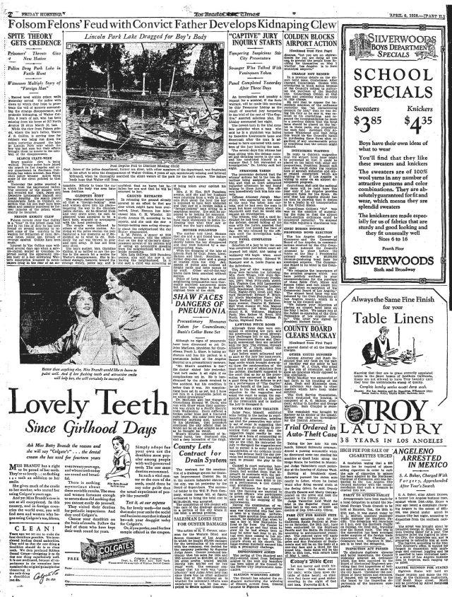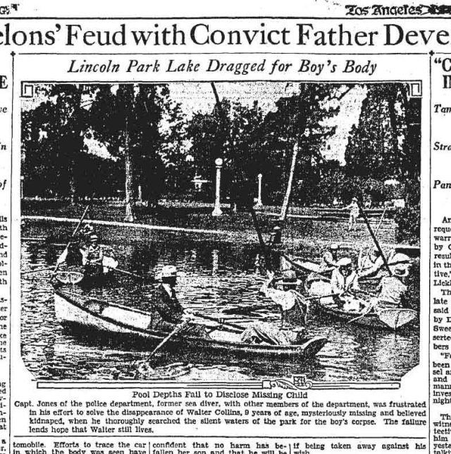 ![]() Police Capt. Jones and LAPD officers search the lake in Lincoln Park for the body of Walter Collins, Los Angeles Times, April 6, 1928. |