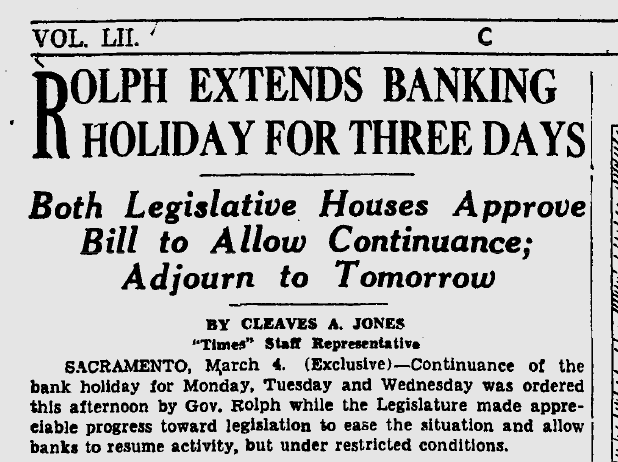 On March 1, 1933, California Gov. James Rolph declared a bank holiday that was supposed to last three days but didn’t end until newly inaugurated President Roosevelt reopened the nation’s banks on March 11. Just in time for the Long Beach earthquake.