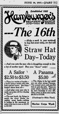 This 1917 postcard from Mullen & Bluett advertising Straw Hat Day has been listed on EBay. For many years, menswear stores in Los Angeles promoted Straw Hat Day or Straw Hat Week at the beginning of summer. And, of course, they promoted Felt Hat Week in the fall.