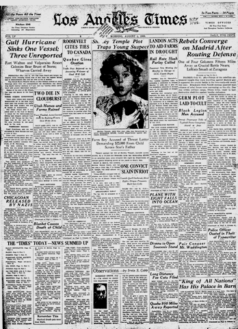 The Aug. 1, 1936, edition of the Los Angeles Examiner has been listed on EBay. I thought it would be illuminating to compare it to the cover of The Times.  Both are eight-column pages, but The Times has crammed in far more stories, plus a three-column index in the lower left corner.  We sure  like headlines like “SHIRLEY TEMPLE DEATH PLOT!”   [The Times: “Shirley Temple Plot Traps Young Suspect.”]