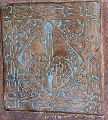 This Batchelder tile, above left, showing a pair of peacocks, has been listed on EBay. Interestingly enough, it’s the same pattern as the piece on the right, which I found in Aimee Semple McPherson’s quarters at Angelus Temple on a tour several years ago. Bidding on a pair of these peacock tiles, marked Batchelder Pasadena, starts at $137.50.