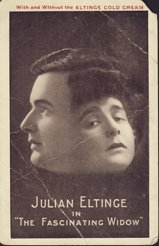 This rather bedraggled postcard of Julian Eltinge in “The Fascinating Widow” has been listed on EBay. Hm. Eltinge Cold Cream is a new one on me.