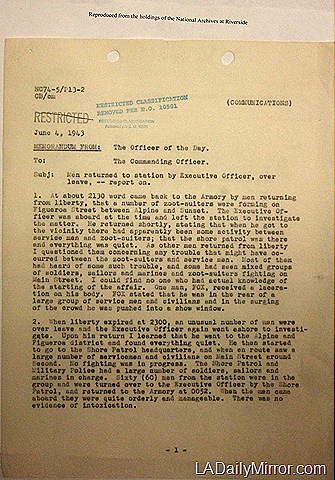 June 5, 1943: Commanding Officer Martin Dickinson orders Lts. Litten, Bacon and Glasson to compile a report on the Zoot Suit Riots.