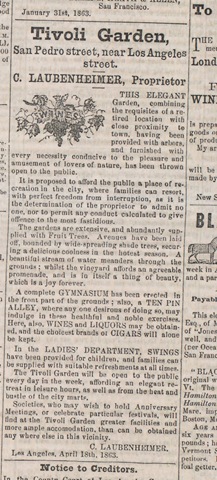 The location is a bit puzzling because Los Angeles and San Pedro Streets are parallel in the earliest map I can find, in W.W. Robinson’s “Lawyers of Los Angeles.”  Harris Newmark (“Sixty Years in Southern California) says the Tivoli Garden — operated by a different proprietor — was  “on the Wolfskill Road (Page 273), noting “as there was no charge for admission, the place was well patronized.”